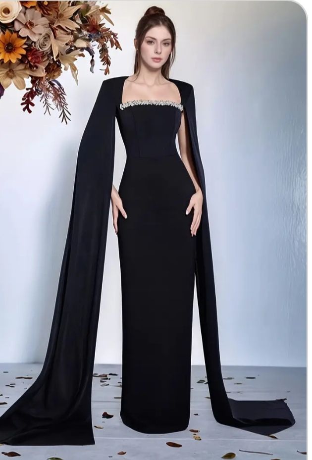 Own the room in our Obsidian Empire Column Dress, a sleek floor-length powerhouse in matte black crepe with a high empire waist for statuesque elongation. The portrait collar neckline frames the shoulders with angular pleats that cascade into a straight silhouette, ending in a dramatic front slit and hidden side pockets for modern ease. Gunmetal chain accents at the waist add edge without excess. Striking for galas, weddings, or power nights out. Available in obsidian black, ruby red, and sapphire blue; sizes 0-28.